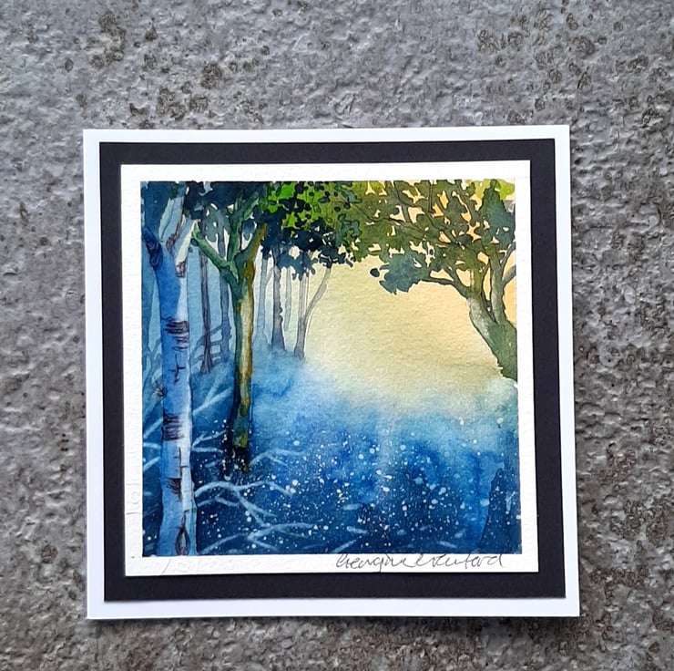 A beautiful watercolour painting of light filtering through woodland, made into a card and ideal to send as a gift for framing. There's plenty of space for you to write your message inside.