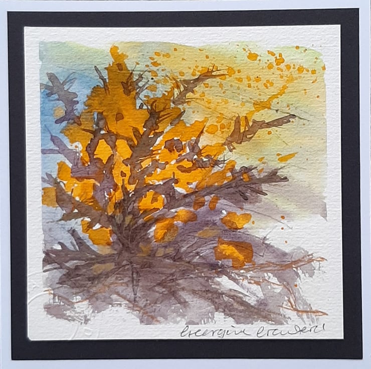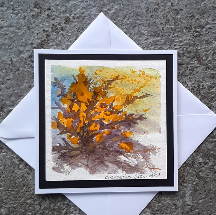 A beautiful, abstract watercolour painting of wild gorse, made into a card and ideal to send as a gift for framing. There's plenty of space for you to write your message inside.