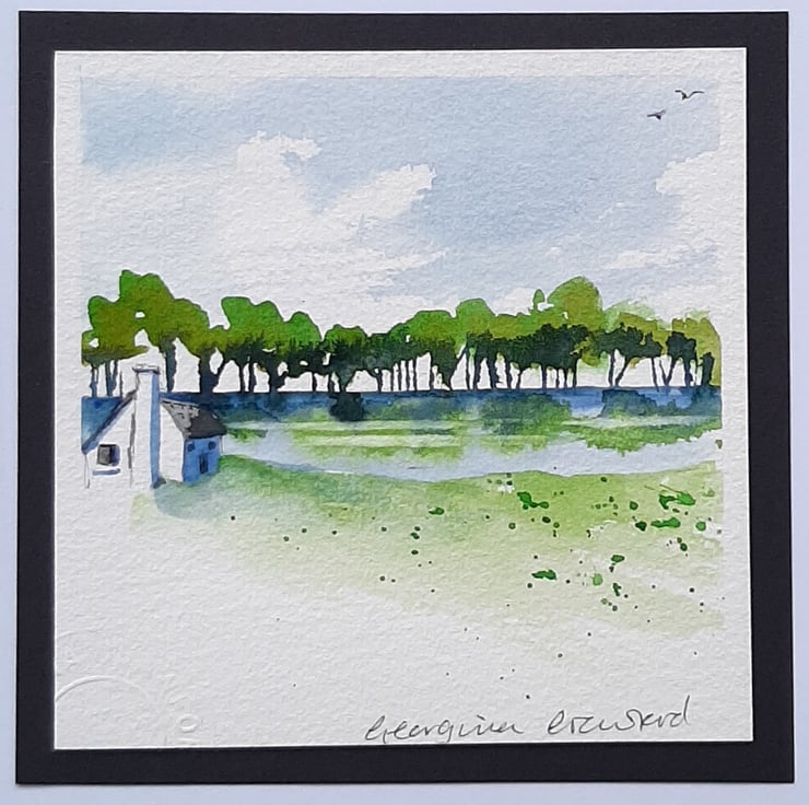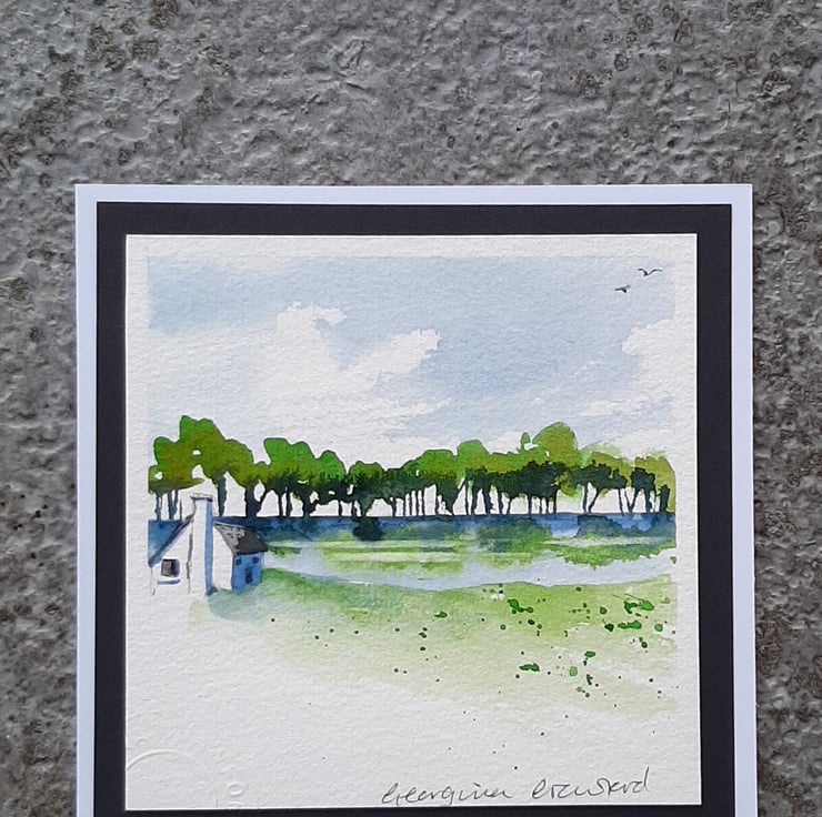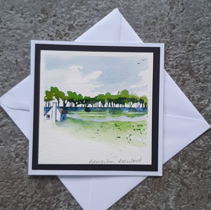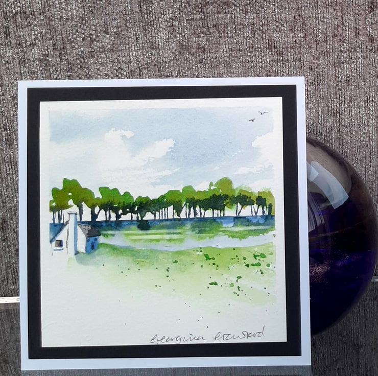 A beautiful watercolour painting of another white cottage, made into a card and ideal to send as a gift for framing. There's plenty of space for you to write your message inside.