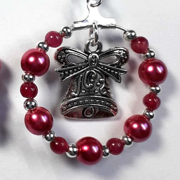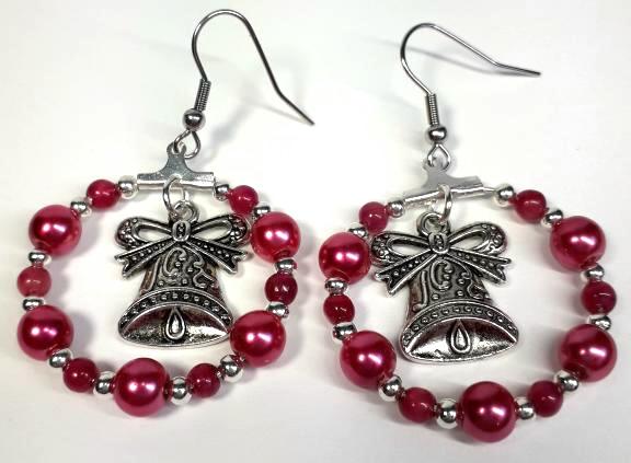 These hoop earrings are 3cm diameter, they have an antique silver tone bell charm surrounded by a ring of wine coloured glass pearls, small wine glass beads and silver spacer beads.