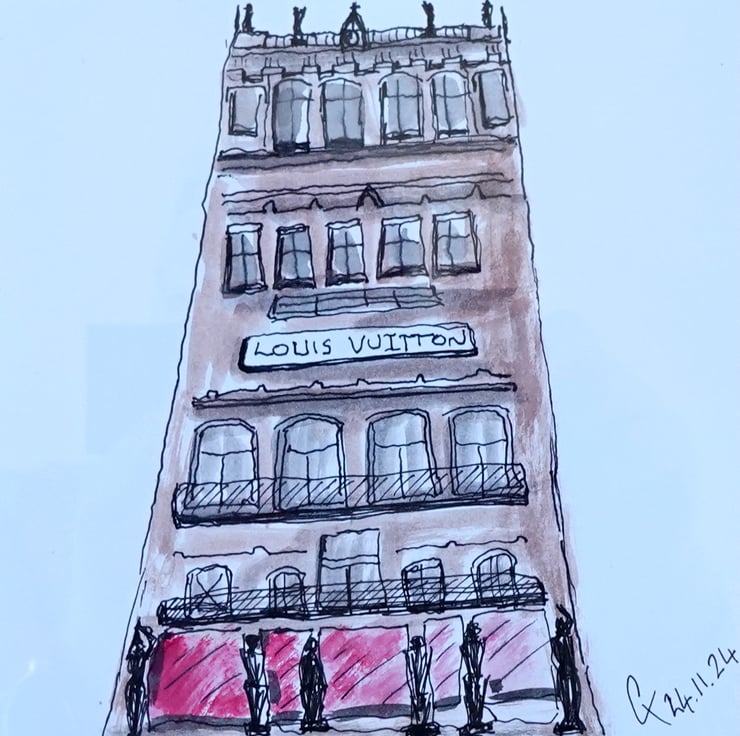 Based on the Louis Vuitton building in Vienna, I have drawn this on white card in pen and ink. I have focused on keeping the lines loose and interesting. The card is mounted, framed and glazed. Size : 13x13inch (33x33cm).