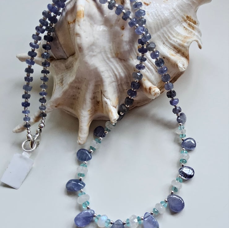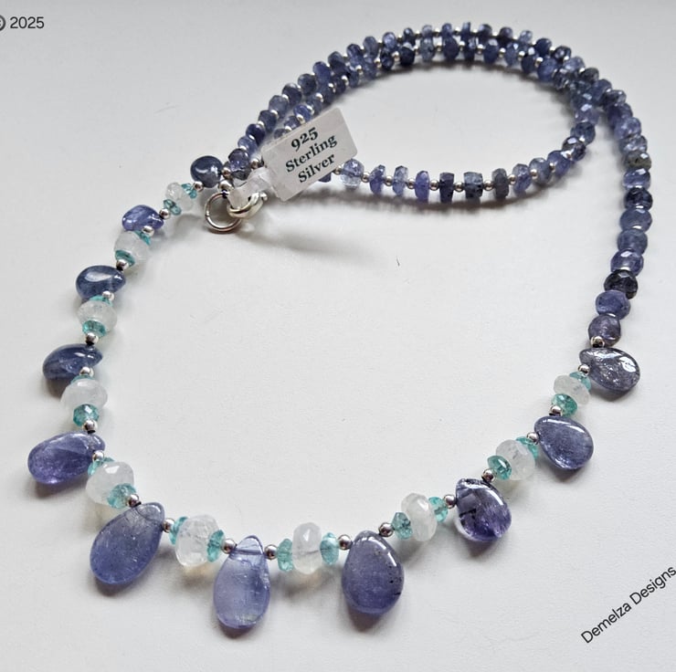 The item has 95cts of AA grade faceted tanzanite pear and rondelle cut gemstones complimented with top quality faceted neon blue apatite and moonstone rondelles. Between the tanzanites are 2mm sterling silver spacer beads adding an opulent feminine look with subtle sparkle during wear.