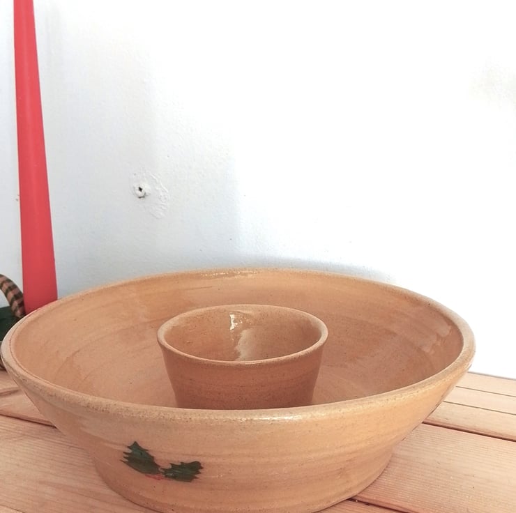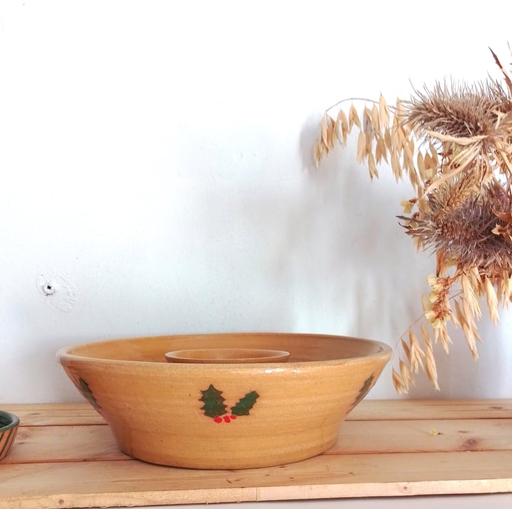 This large pottery chip and dip bowl "thrown" from Penarth Ceramics features hand painted traditional Christmas holly leaf and red berries motif, making it perfect for serving chips and dips during the festive season. The round bowl has a leadless glaze glossy finish adding a touch of Christmas cheer to your tableware collection. Made from stoneware clay, this large bowl is both microwave and dishwasher safe, as well as refrigerator safe for easy storage. With a diameter of 23 and 9 cms and an item depth of 7 and 4.8 cms, this multicoloured serving set is both practical and stylish for holiday gatherings.Capacity is large 800 mls smal bowl 200 mls. Use it for gatherings in years to come and as unique Christmas gift