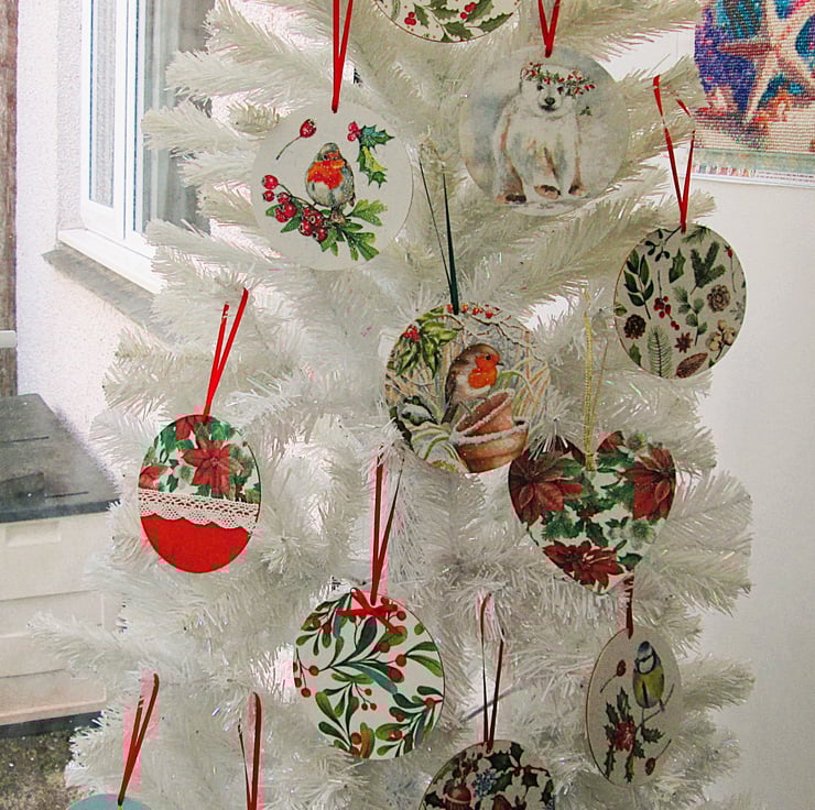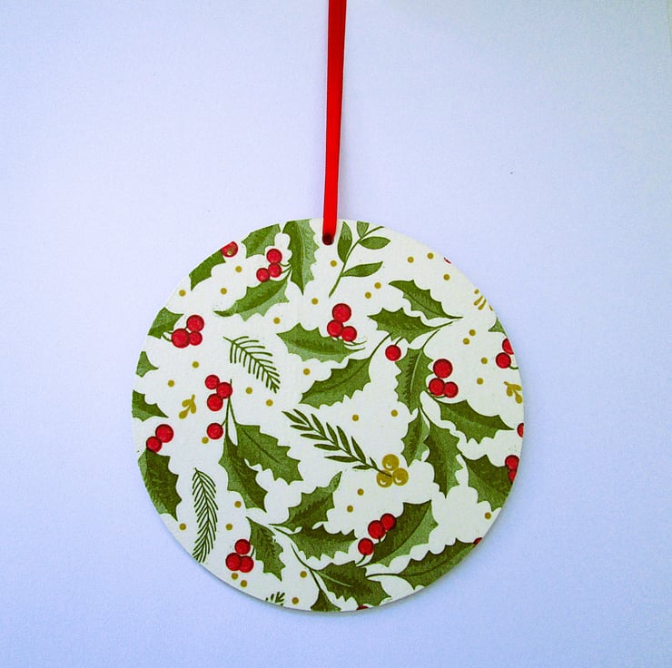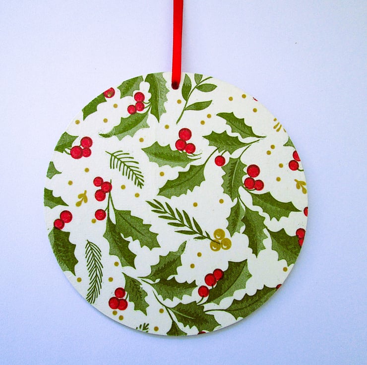 A lovely 10cm decoupage flat wood Christmas bauble is just perfect to add to your festive indoor decor this season. With a matching red ribbon for hanging, it's ready to hang or to gift. The reverse of the bauble is the natural wood.