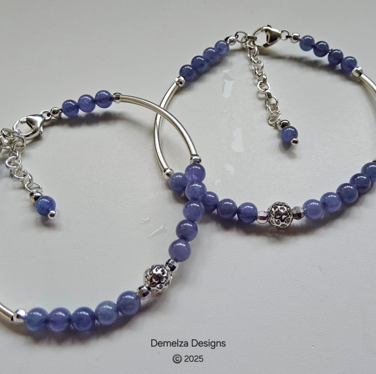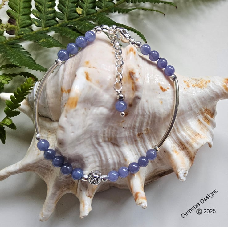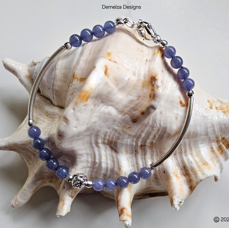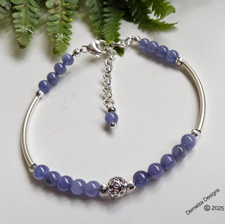 A beautiful dainty bracelet designed and hand crafted in Cornwall using 19cts of 'A Grade 5mm tanzanite plain polished gemstones. To compliment them a 925 sterling silver decorative bead sits in the centre with sterling silver faceted beads, and tubes providing a bangle bracelet style. The sterling silver heavy weight extender chain has a small tanzanite bead at the end giving a professional finish with a 7mm lobster clasp and crimp covers. Please refer to photograph for image of smaller size bracelet available.