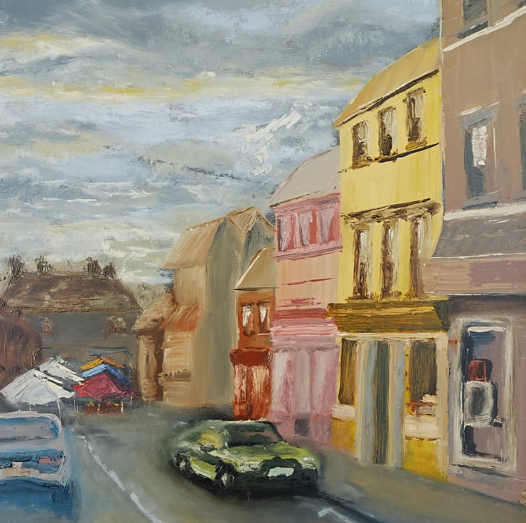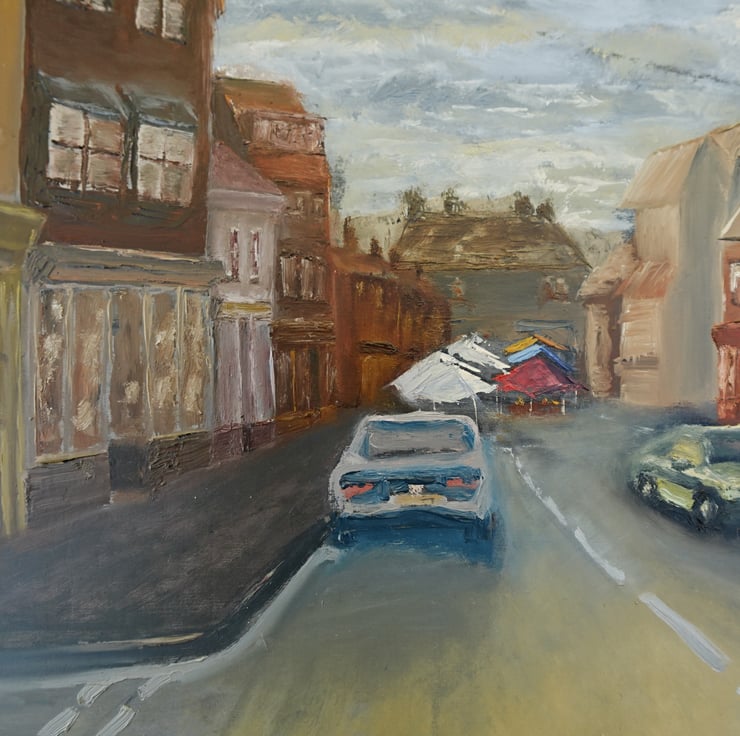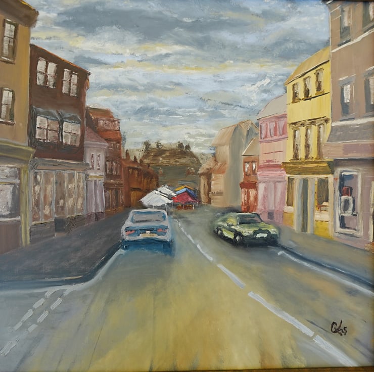 I've painted this scene a number of times, in acrylic and as a street sketch in ink. I was drawn to this image and wanted to get it right before really trying it in oil paint. When I painted this oil, I spent time not only on the setting and feel of the morning light and dramatic sky, but I enjoyed putting detail into the shop fronts and window ledges. The road lines were a key part of the composition leading you into the image and down to the market getting ready for the busy day ahead.