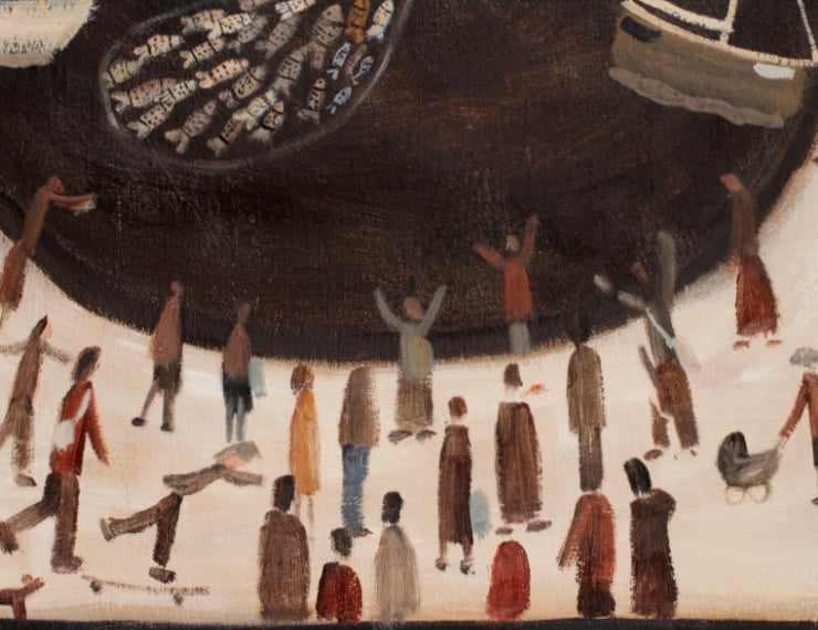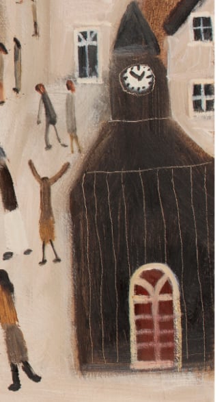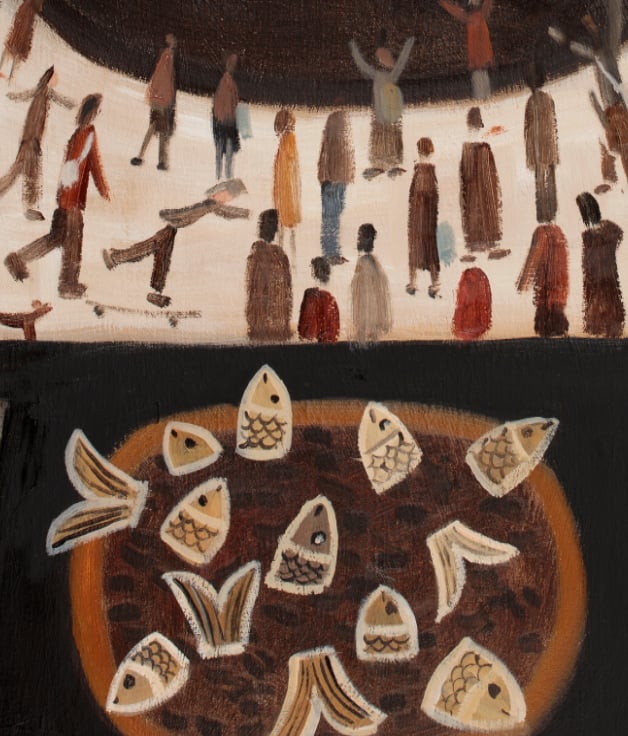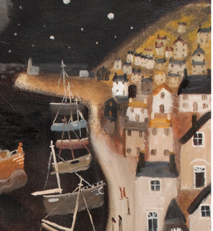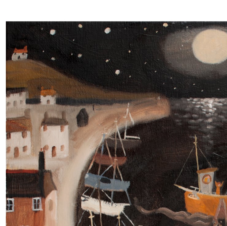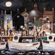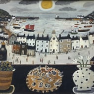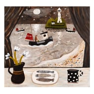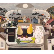 It is a print of an original of the story of M and the Starry gazey Pie. Briefly the legend goes that the Town was suffering a famine and this one boat went out of the harbour and caught a bumper catch saving the lives of the community. Every year this event is celebrated in Mousehole by baking what is essentially a Fish pie.