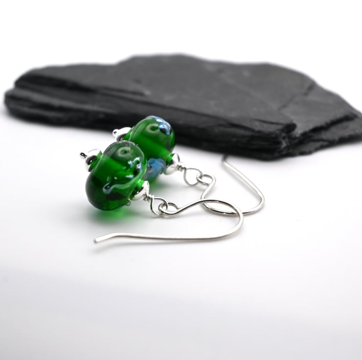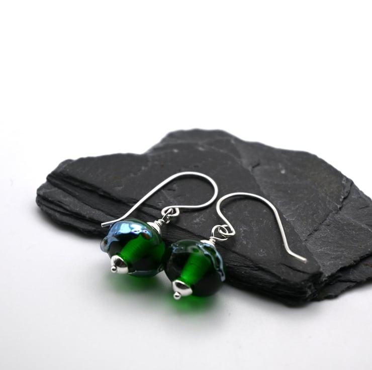 A pair of sterling silver earrings which feature handmade lampwork glass beads.
