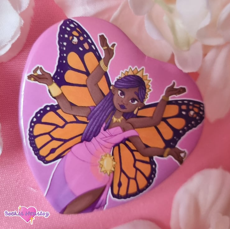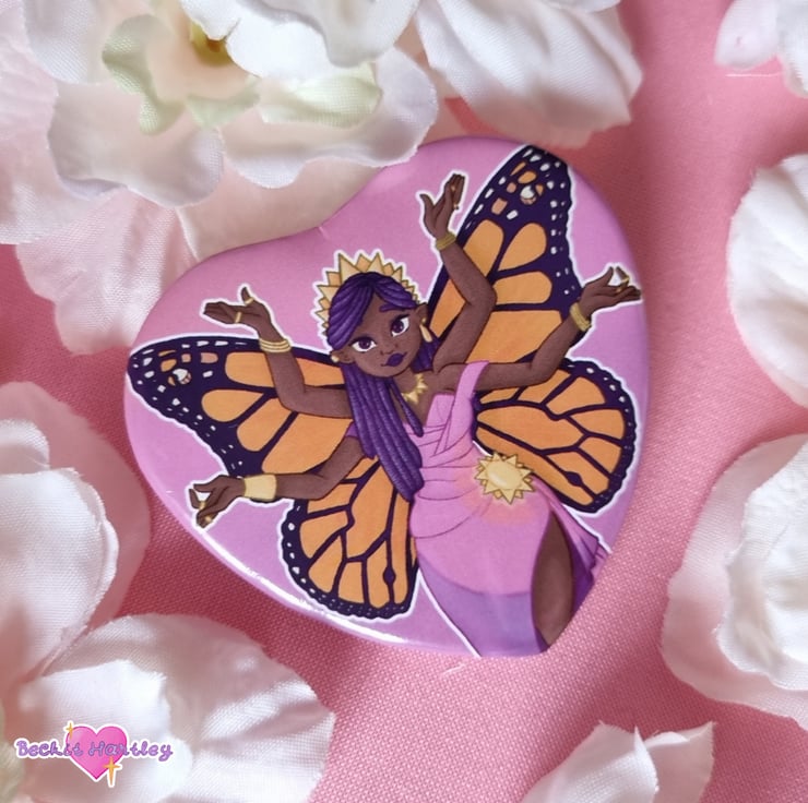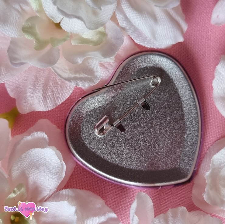 Featuring an original sun goddess illustration, this adorably heart shaped button badge measures approximately 5.5cm x 5.5cm and would look great in an ita bag or on a jacket!