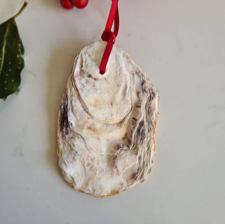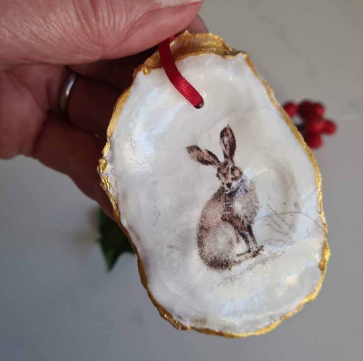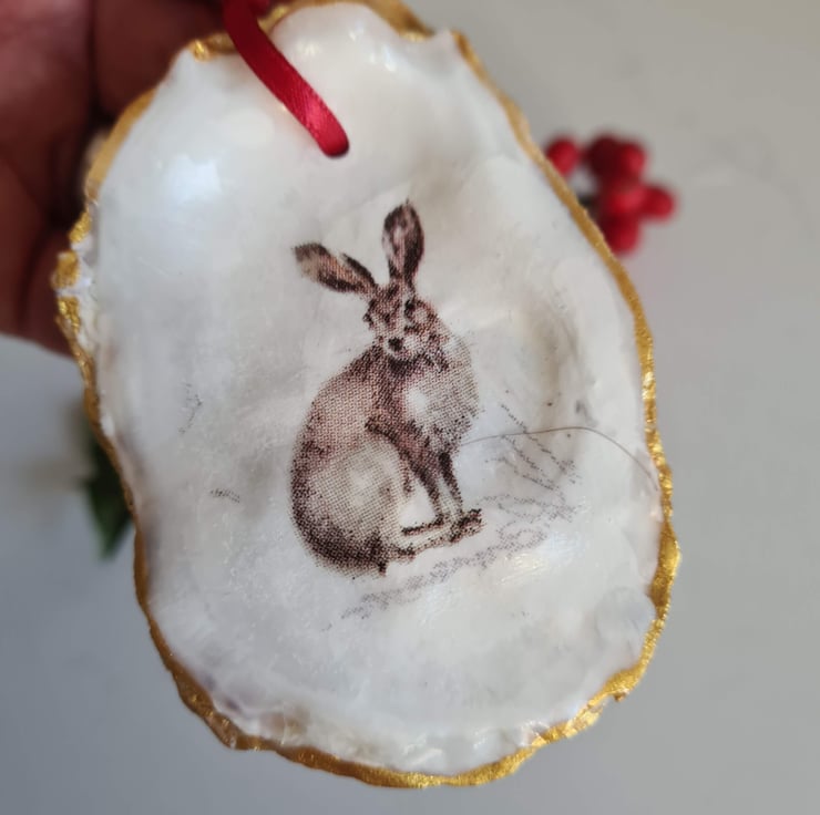 This oyster shell hanging decoration has been decorated with decoupage using a charming wodland hare odesign. I have painted the edge in gold paint, sealed it with gloss varnish and finished the decoration with a pretty red ribbon. I have varnished the back so you can see the lovely natural colours of the shell.