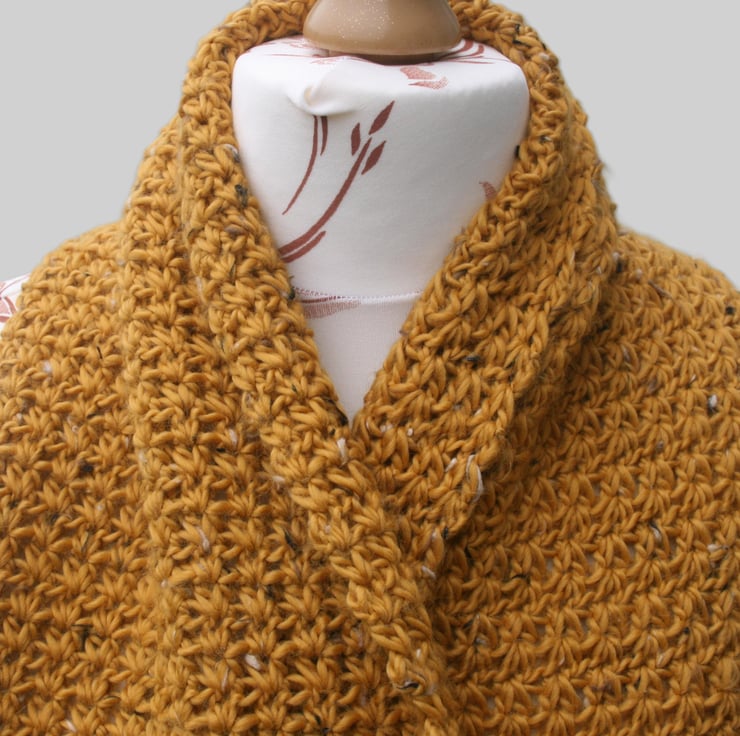A pretty, vibrant mustard scarf with subtle flecks of black and white wool throughout. It is 94% Recycled Polyester, 4 % Acrylic. 2% Viscose. Suitable for everybody.