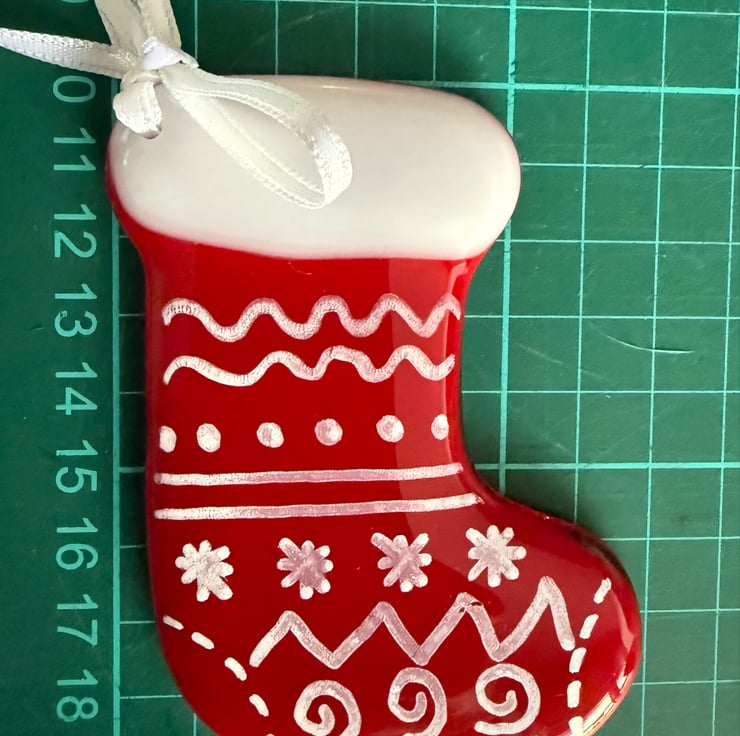 This unique fused glass Christmas stocking decoration was made by cutting two layers of glass shapes, and adding a third top layer of white for the roll top. These were fused at 790 degrees Celsius to form one solid form. The decorative features were hand drawn with an acrylic pen which holds permanently at such high firing temperatures.