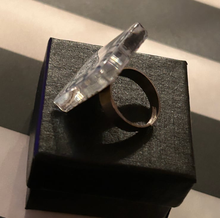 The glass tile measures approximately 1” square. A real statement ring and totally unique..