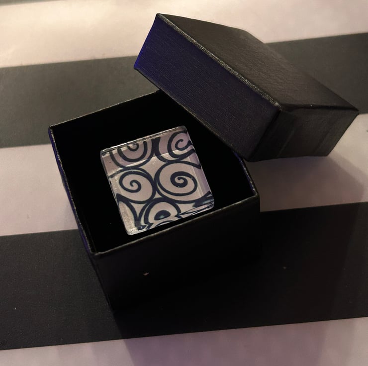 Gorgeous handmade glass tile ring with swirly mono chrome design.