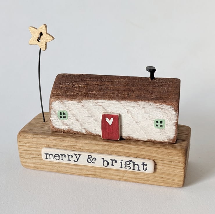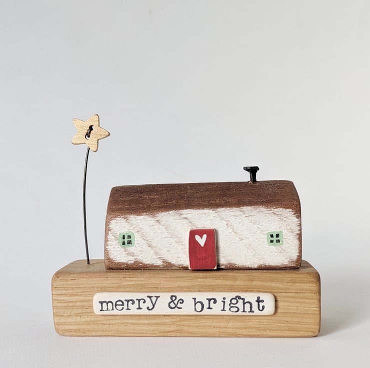 This is one of my tiny little houses, sitting on a lovely reclaimed wooden block. A shining star above makes a joyful festive scene.