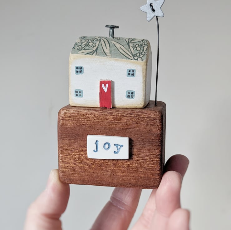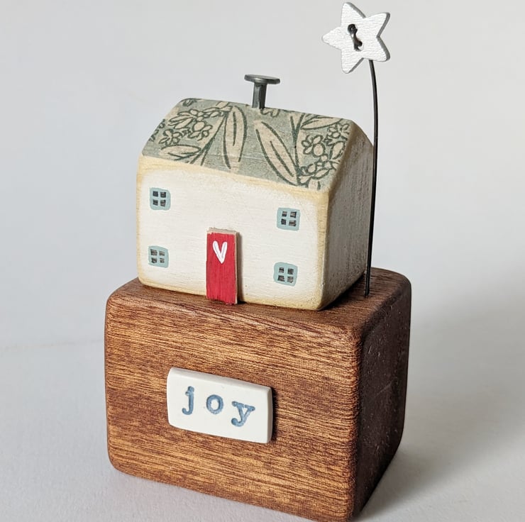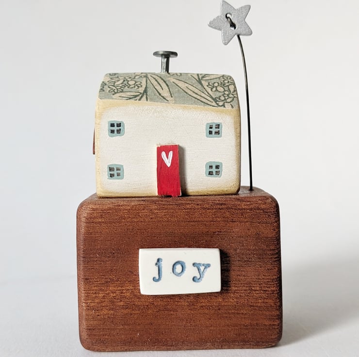 This is one of my tiny little houses, sitting on a lovely reclaimed wooden block. A shining star above makes a joyful festive scene.