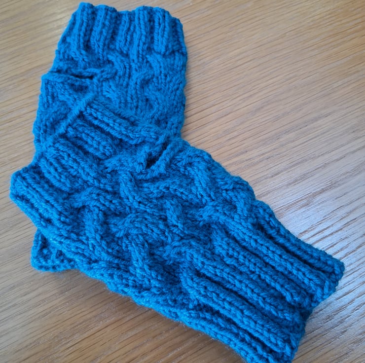 Handmade fingerless gloves. Lovely cable pattern. Very warm. One size. These are a petrol blue colour, they didn't photograph well and show up as a lighter blue. Great stocking filler. 2nd class postage applies.