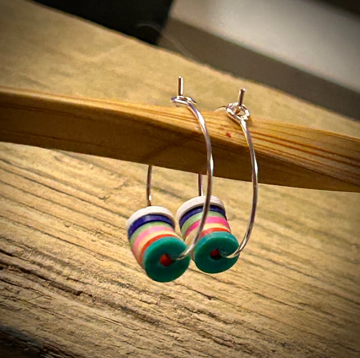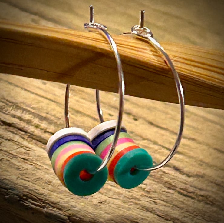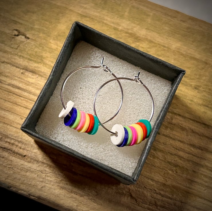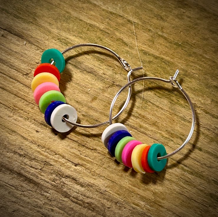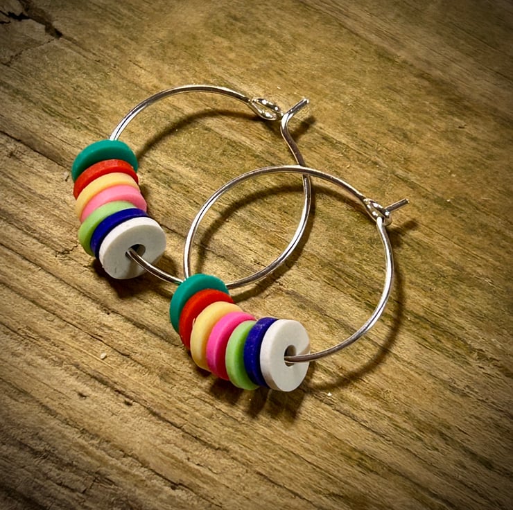 20mm silver plated hoops with multiple polymer beads in multicoloured shades.