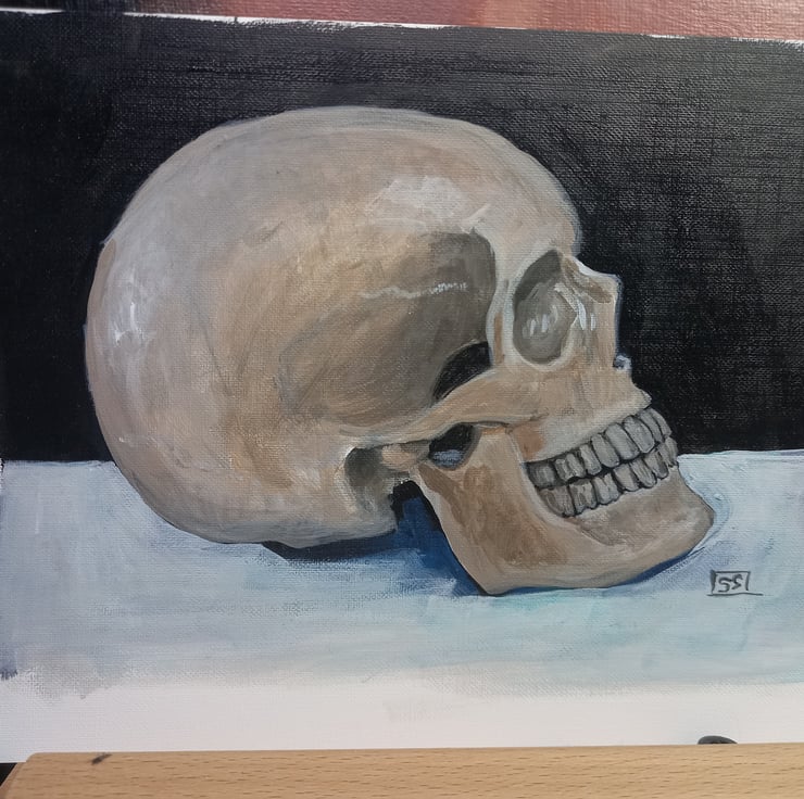This is the second of three skull studies up for offer. Painted on 7" x 10" canvas textured paper.