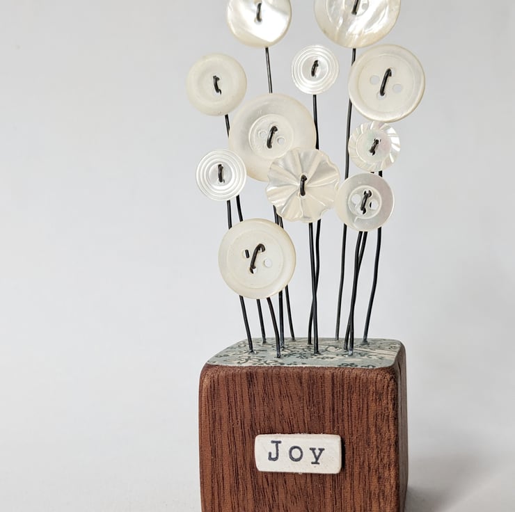 Standing on their wire stalks in a decoupaged wooden block an array of mother of pearl button flowers.