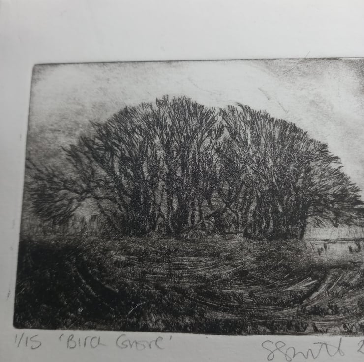 This sweet little etching is of a birch grove we came across while exploring in deepest Exmoor a couple of years ago. It is made from a plexiglass plate using fine etching tools and is printed with Divolo etching ink on Fabriano paper. The printed image measures approximately 3"x4". This is number 1 of a limited edition of 15.