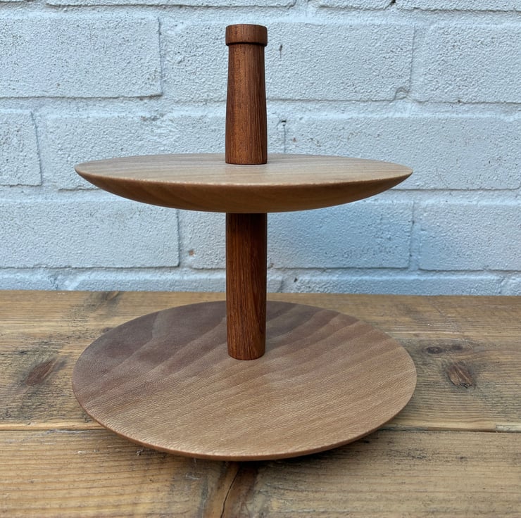 This tiered cake stand has been handmade on our woodturning lathe from pieces of London Plane timber (plates) and Iroko (spindles). The stand can be unscrewed and taken apart for storage. The bottom plate is 20cm wide and the top is 18cm, it stands at 21cm tall.