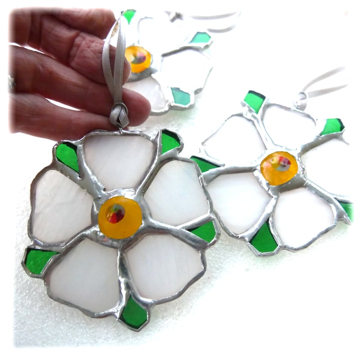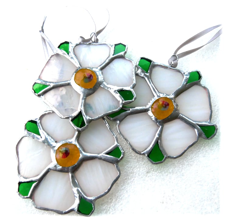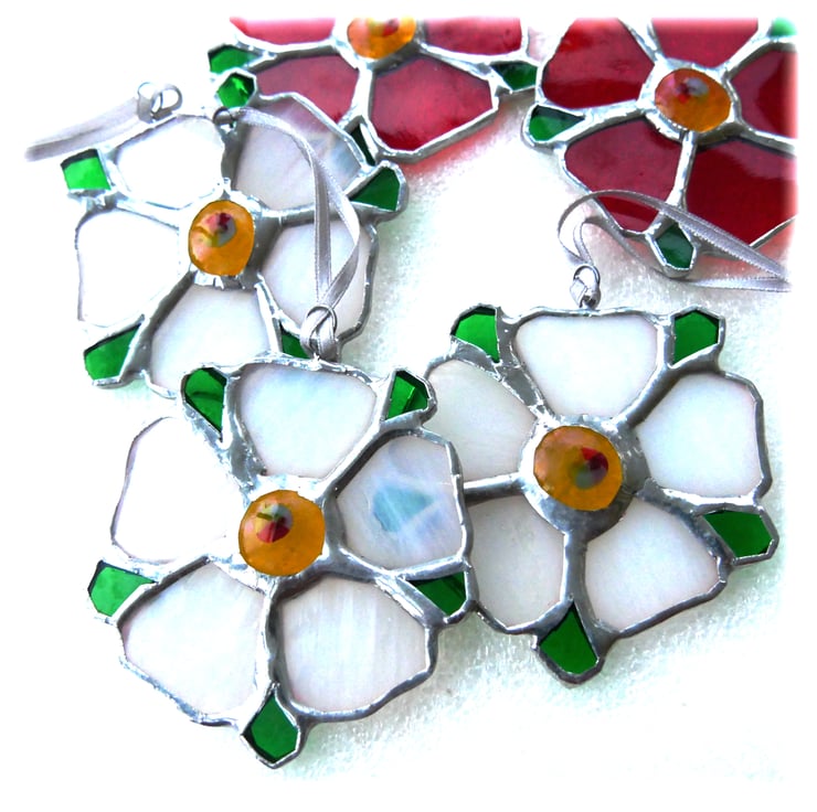 The rose is a small vrsion of the classic Yorkshire / Lancashire design having a single ring of 5 white glass petals and a ring of little green leaves.