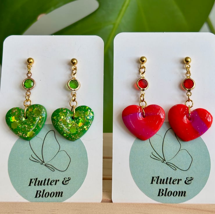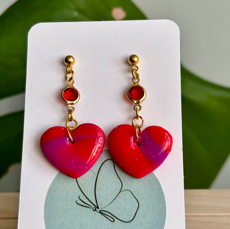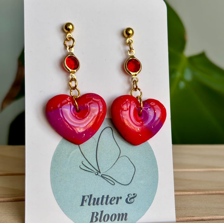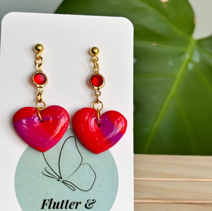 A vibrant pair of heart earrings, handmade with shimmering red and purple polymer clay, varnished with resin and flecked with glitter for extra sparkle. Each heart dangles beneath a ruby-toned gem framed in gold, creating a bold yet romantic look that’s perfect for party season or heartfelt gifting.