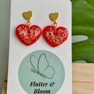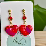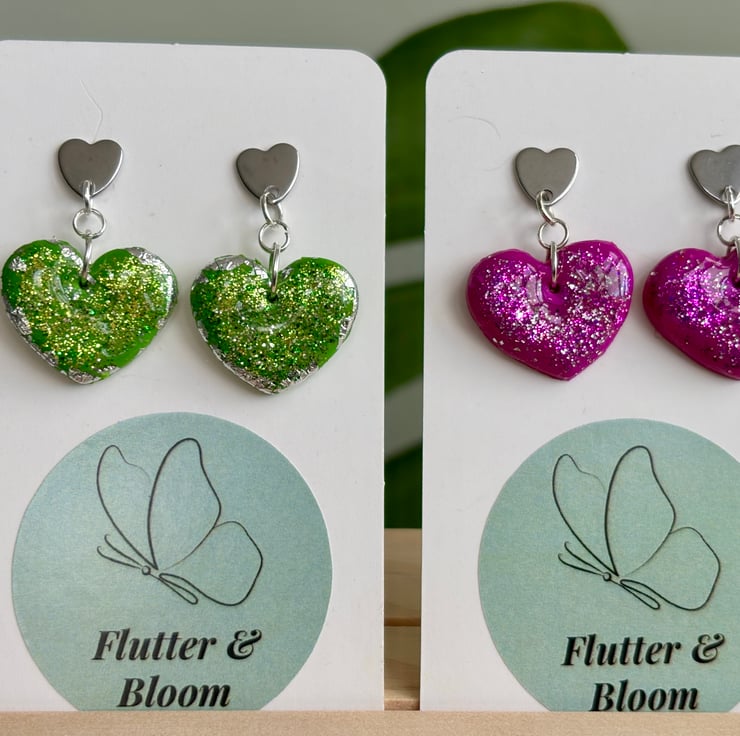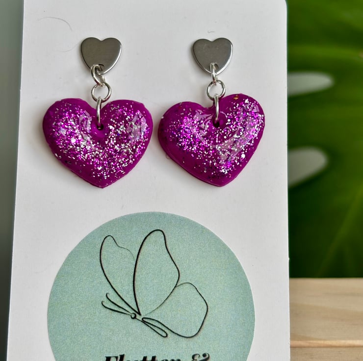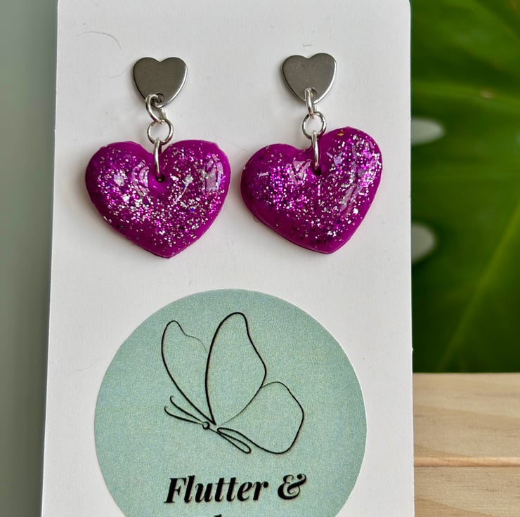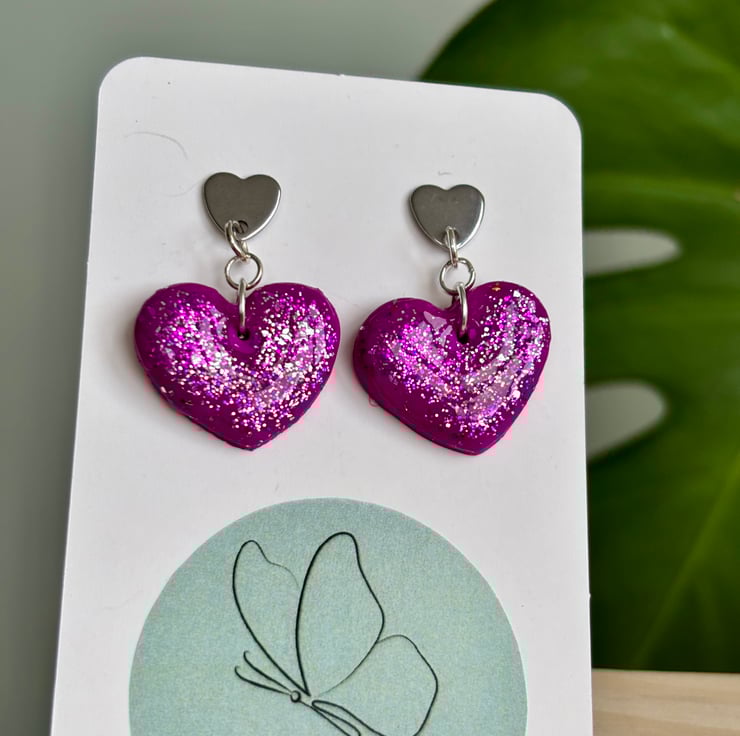 A pair of sparkling cerise/ magenta pink heart earrings, handmade with love and flecked with silver glitter for a magical finish. Each heart dangles from a silver coloured stud shaped like a tiny heart — a sweet detail that adds charm and elegance.
