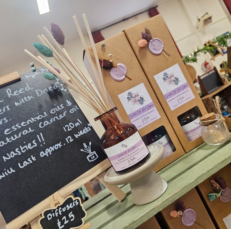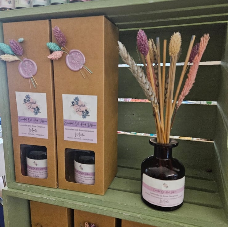 Just essential oils and a natural carrier oil my wonderful diffusers contain no synthetic fragrances. They are 120ml and last approx. 12 weeks. Each diffusers comes with a selection of dried flowers and natural rattan reeds. Beautifully presented in their box with wax seal.