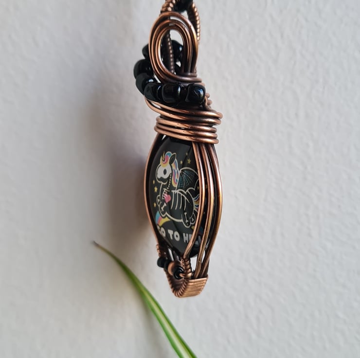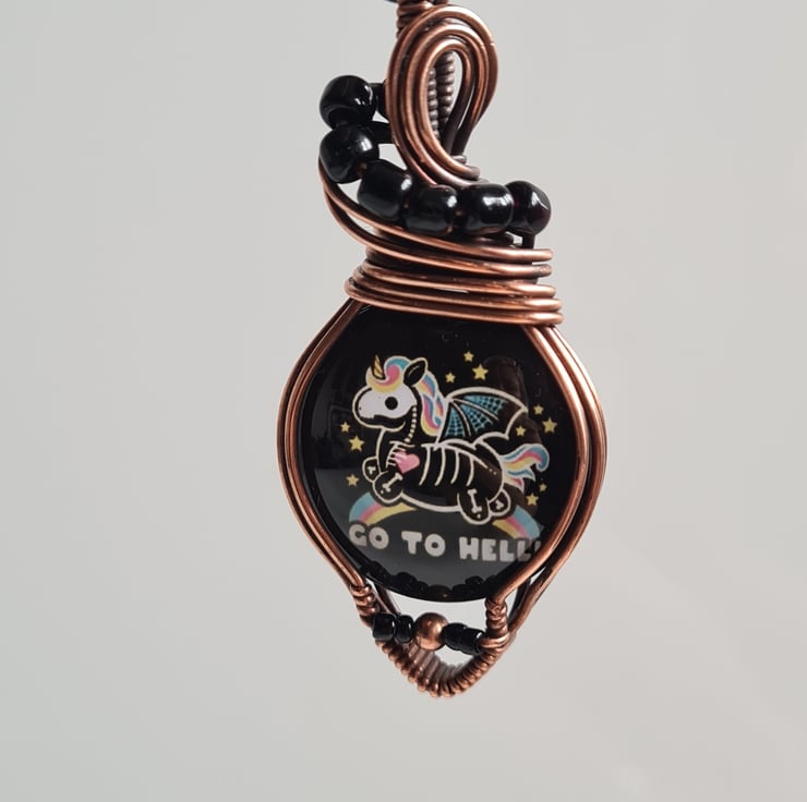 I have handcrafted this unique and one of a kind pendant using this very cool " Got To Hell" Unicorn glass cabochon which I have wrapped with antiqued copper and finished with black glass beads.
