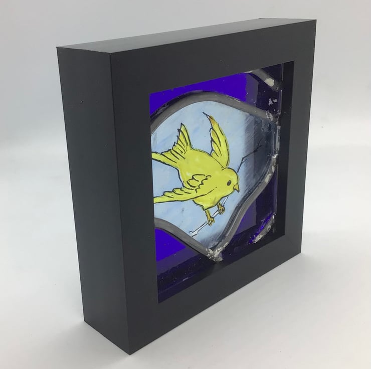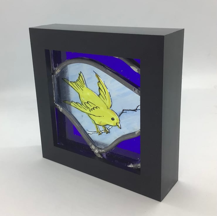 Little yellow bird flying through blue. Hand painted stained glass. Created using historical lead work and kiln firing methods with silver stain and enamel. Unique one-off which will last forever.