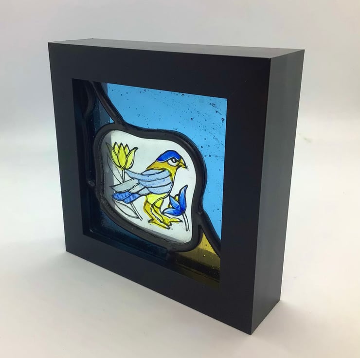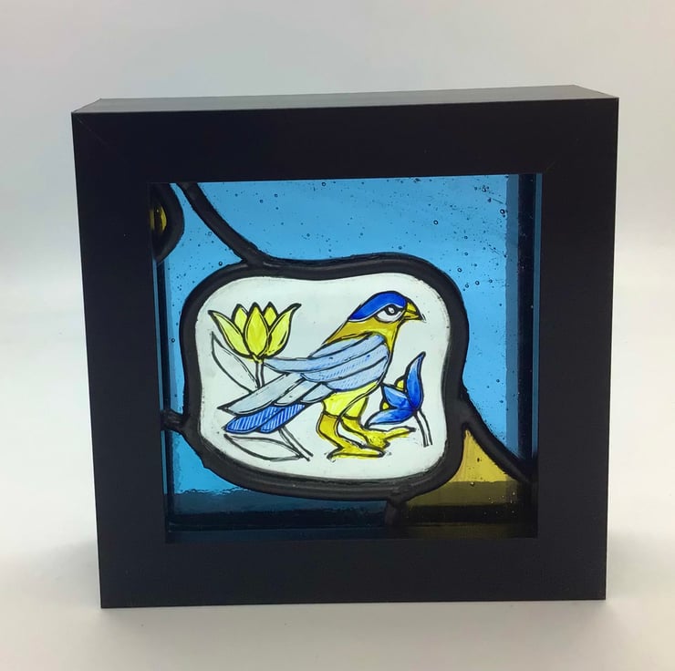 Hand painted stained glass, depicting a blue painted bird. Created using historical lead work and kiln firing methods with silver stain and enamel. Unique one-off which will last forever.