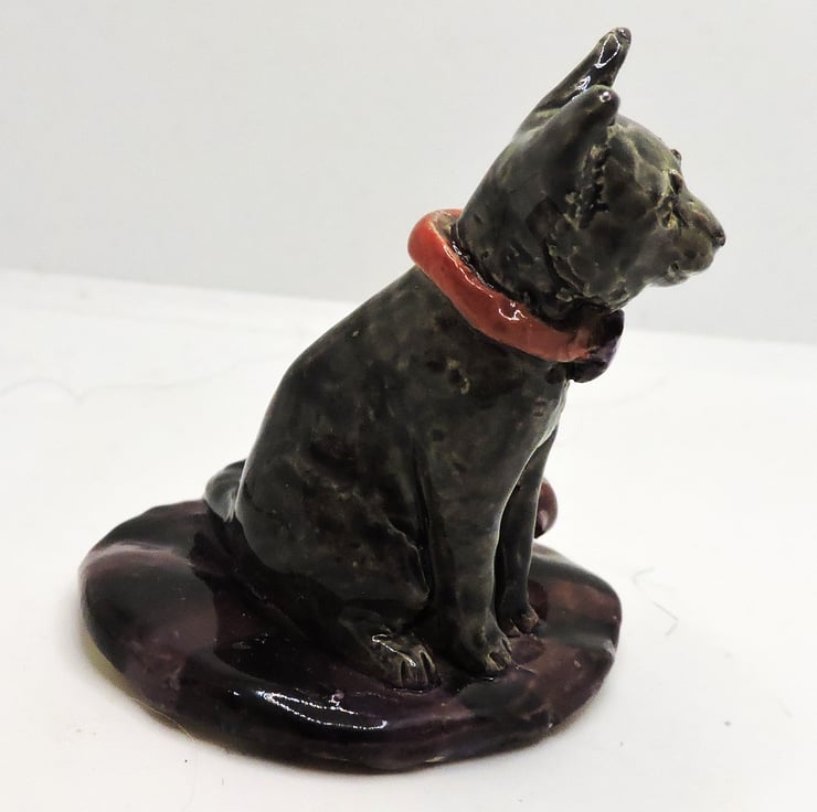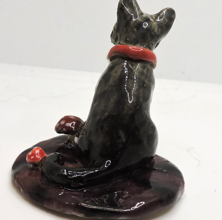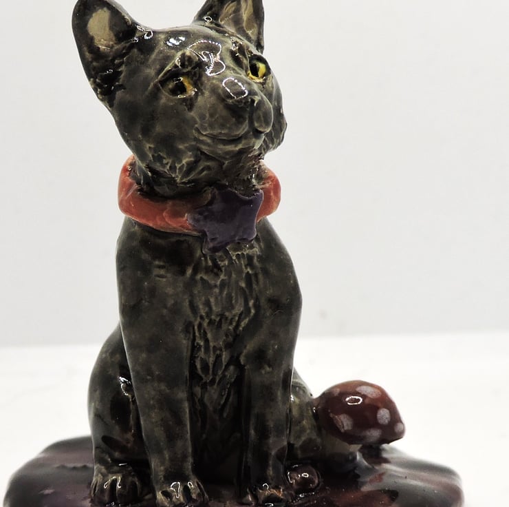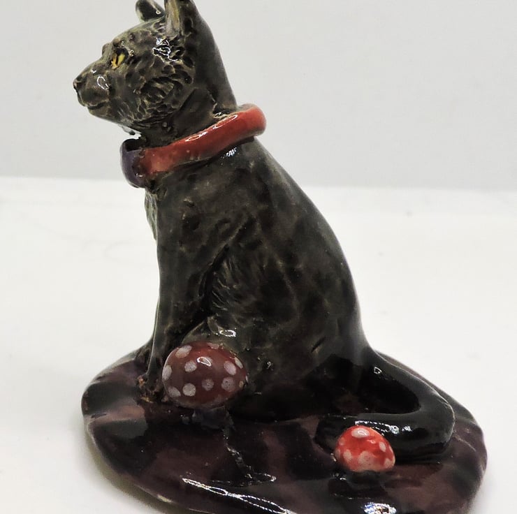 1.5 inch tall ceramic, dark and spooky cat sculpture, handmade by myself without the use of moulds in the UK.