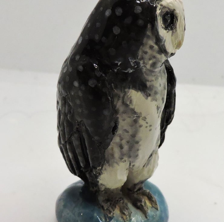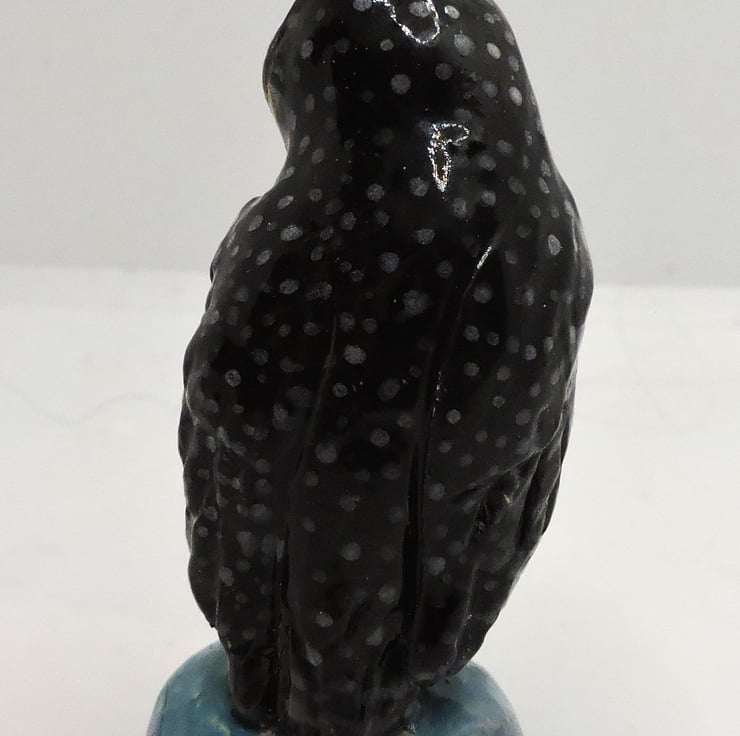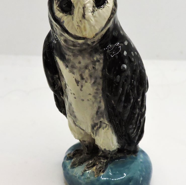 This is a small sculpture of a cute little sooty owl, standing approximately 1 and a half inches tall. All items listed here are sculpted by myself in the UK from from earthenware or porcelain clay. They are fired twice, first to bisque and a second time after being painted with glazes.