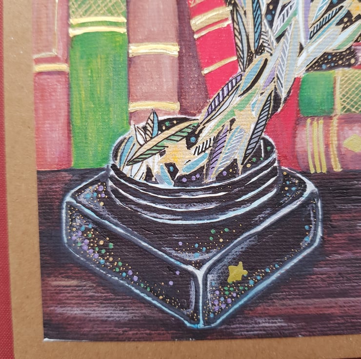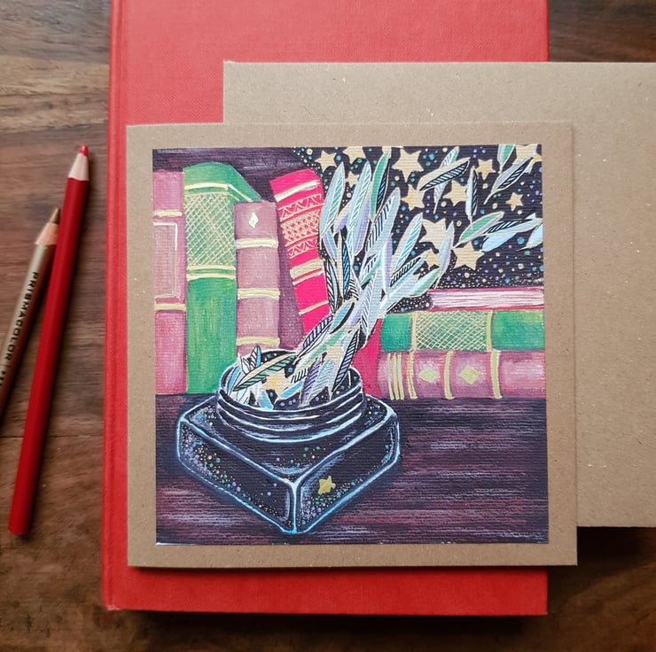 The front panel is a small print created from my original artwork 'Inkwell and books.' It will be a great card for anyone who enjoys reading, writing or creating their own stories and collecting books.