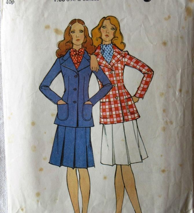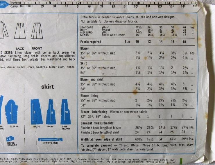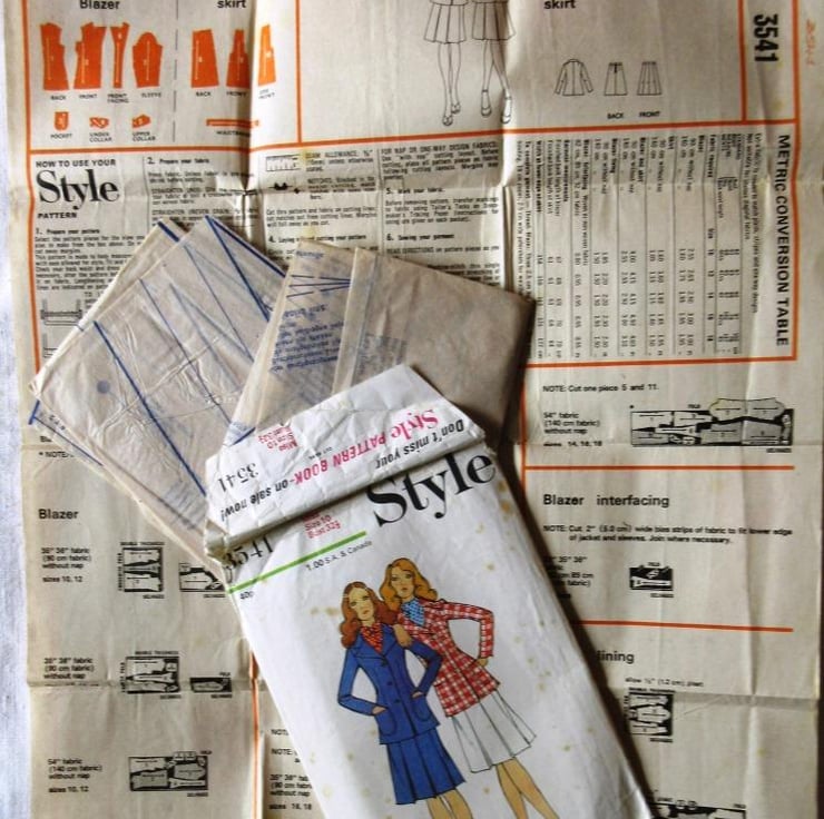 A vintage sewing pattern for a misses' blazer and skirt in size 10 (bust 32.5"/82.5 cm, Style 3541). The lined blazer with centre back seam has collar and revers, front button fastening, long set-in sleeves and top-stitched patch pockets. The skirt, with three front pleats, has waistband and back zipper. All the pattern has been use. The envelope is slightly torn. The pattern is dated 1971.