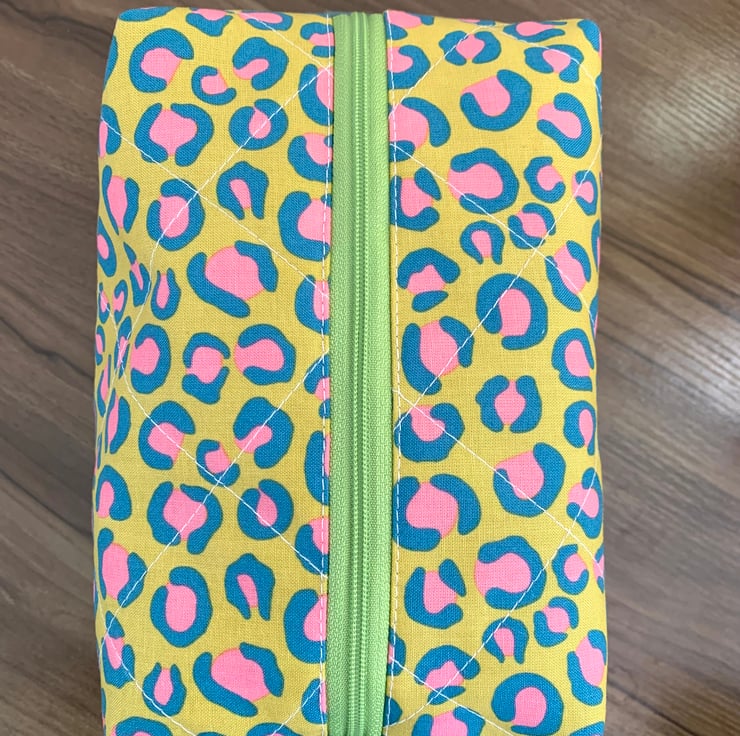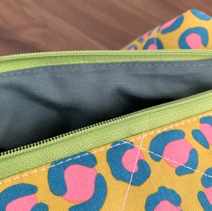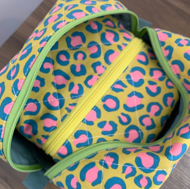 The boxy design gives the pouch structure and provides plenty of storage with a wide zip opening for easy access. The cotton wadding (interfacing) gives a soft padded feel.
