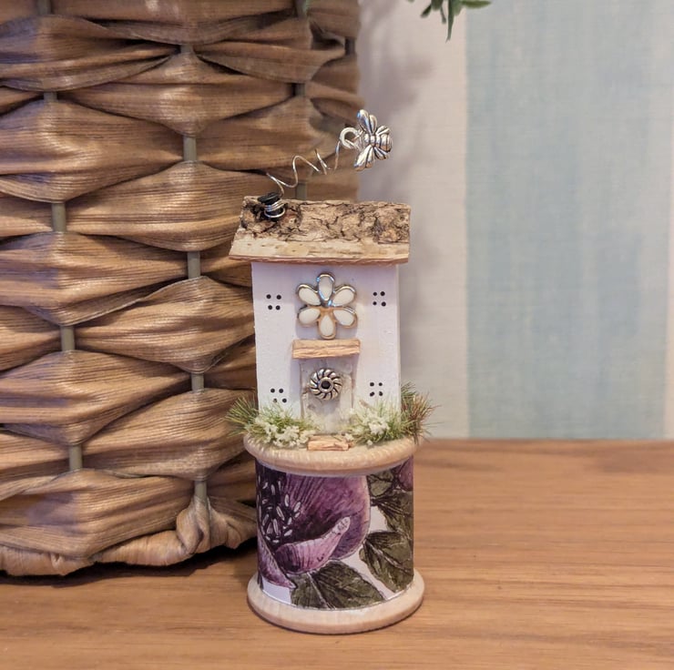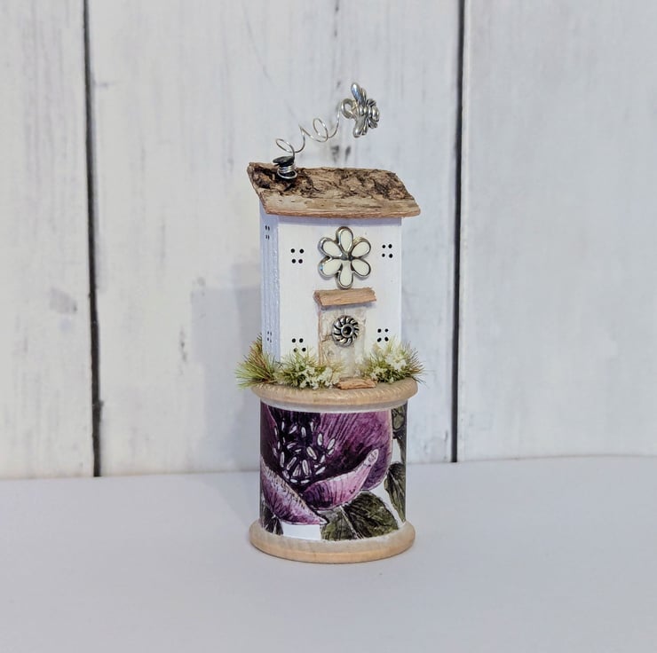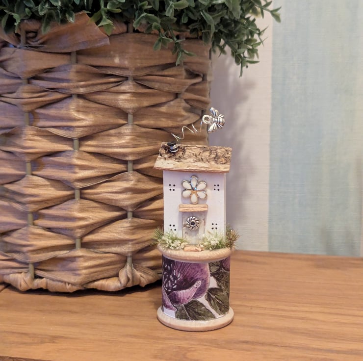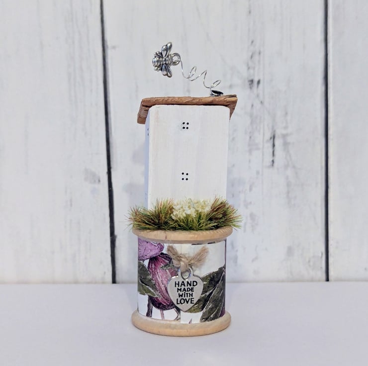 Bee Cottage is a tiny handmade wooden cottage decoration on top of a wooden vintage bobbin.