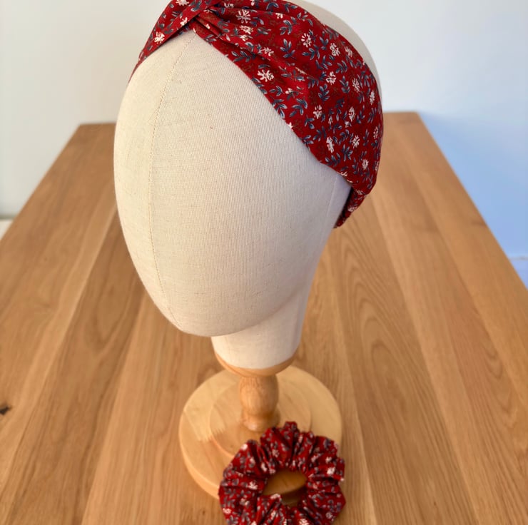 Handmade scrunchie in soft 100% cotton, with a delicate print of cream flowers and grey leaves on a wine background.
