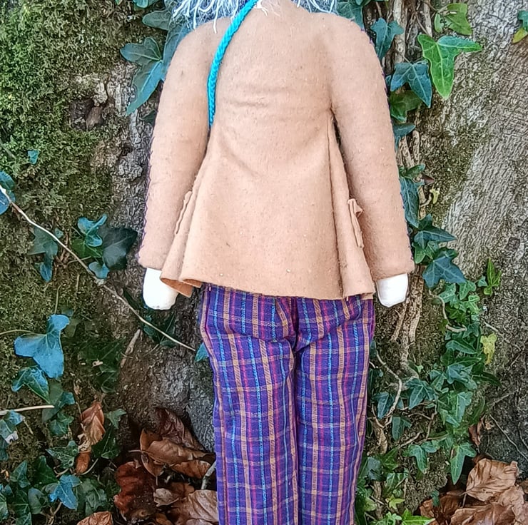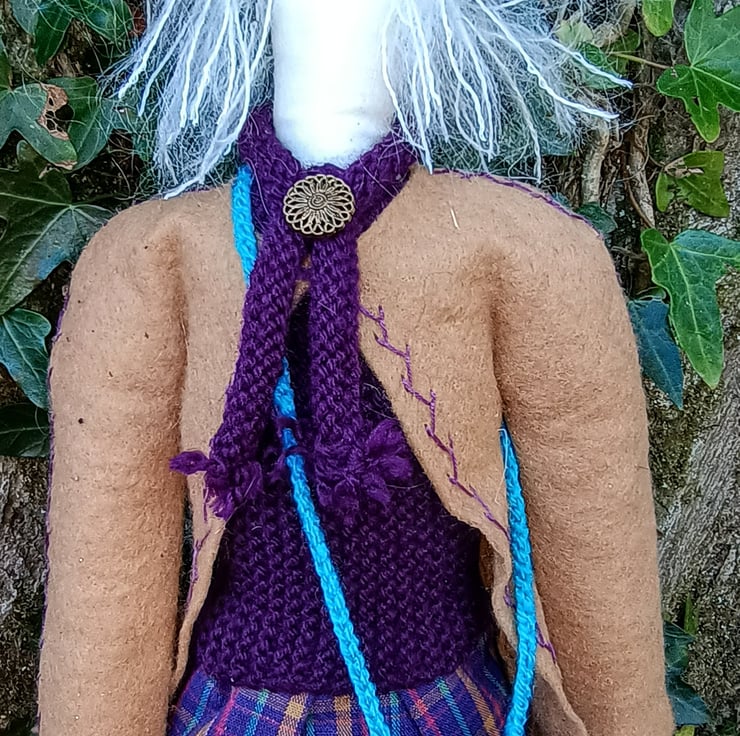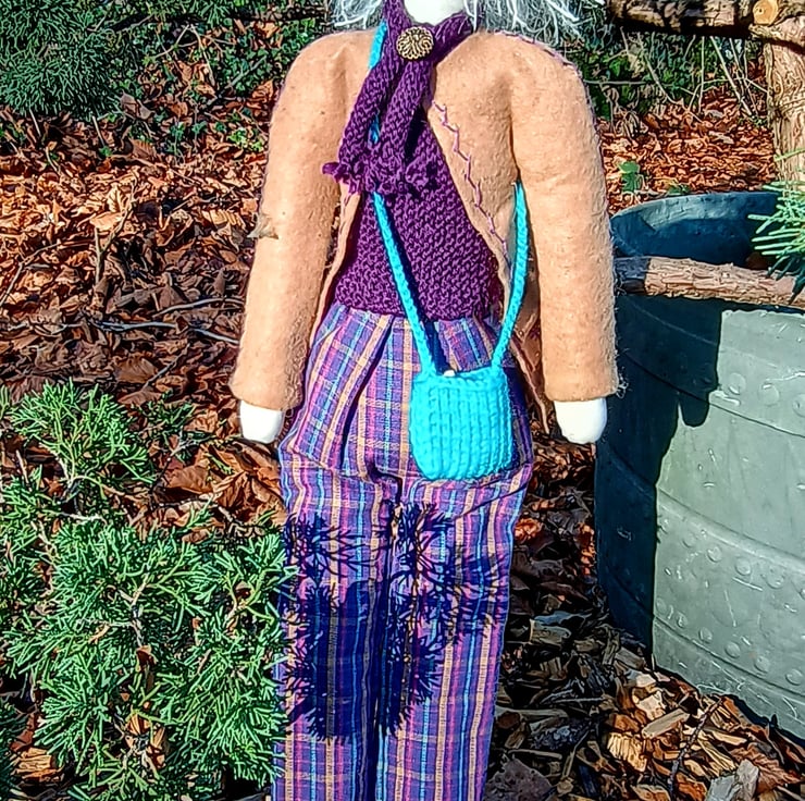 This characterful doll has a simple cotton base body but her wild wool hair and classy designer outfit reflect that she is a very interesting lady indeed! She is sporting plaid trousers, a purple hand knitted jumper, scarf, headband and turquoise bag, finished off with a fawn felt jacket and shoes.