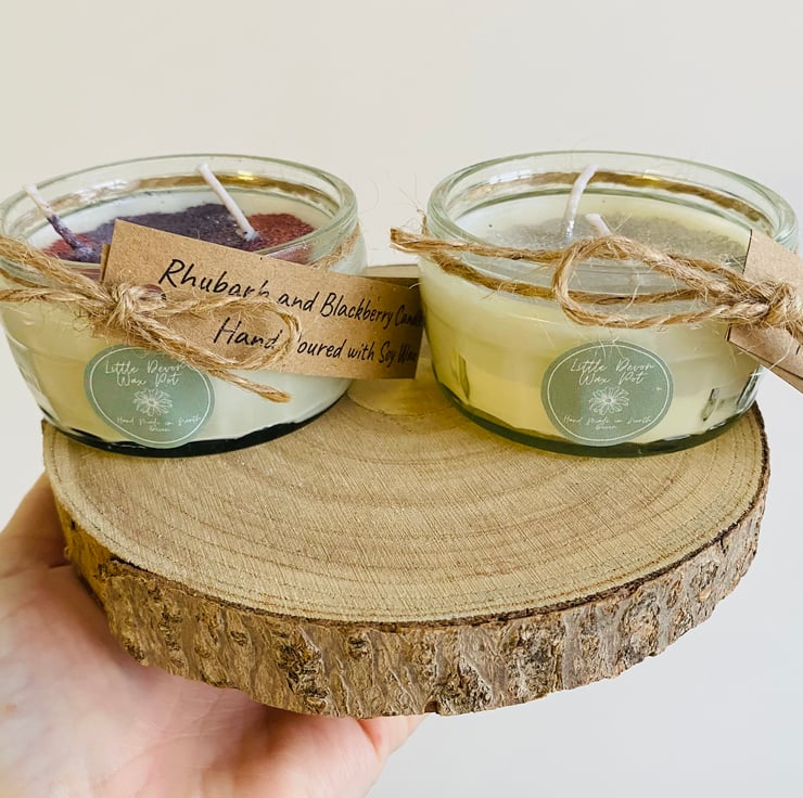 Set of two hand poured soy wax candles. The wax has been melted and fragranced by hand before being poured into reused pudding jars.