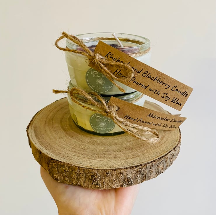 Nutcracker is a beautiful fragrance filled with Walnuts, Chestnuts, Sugar and Vanilla. Rhubarb & Blackberry is an autumnal fragrance with zing. Both candles are sprinkled with biodegradable glitter.