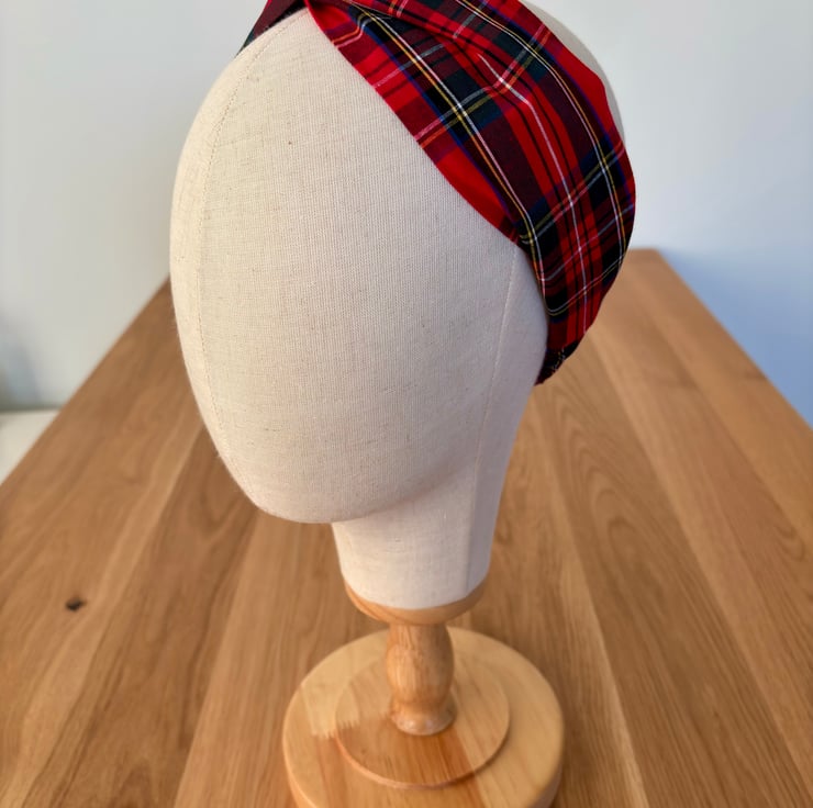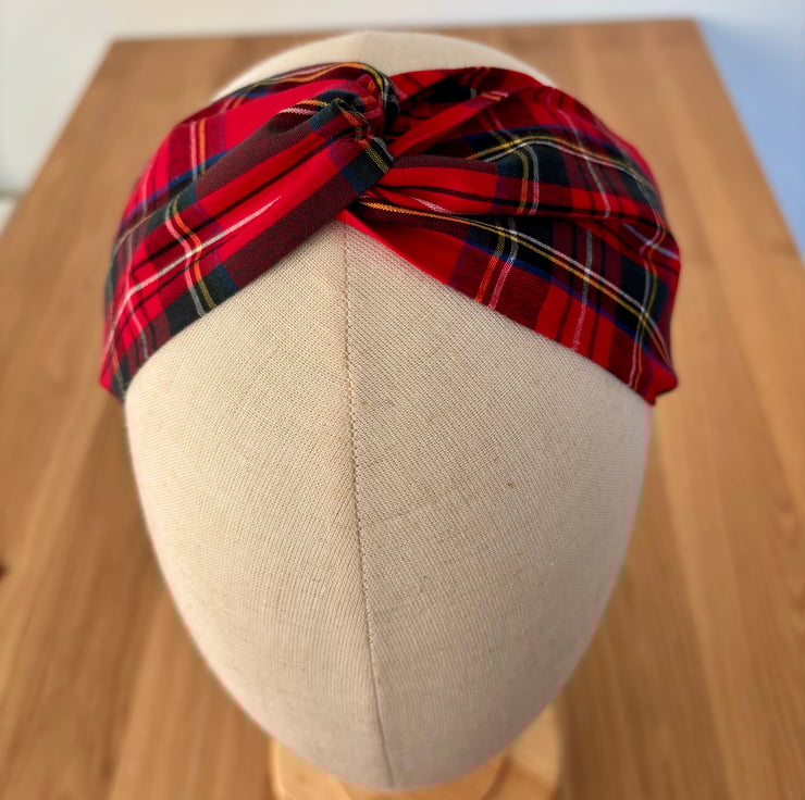 Handmade twist knot headband in soft 100% cotton, in festive bright red tartan!
