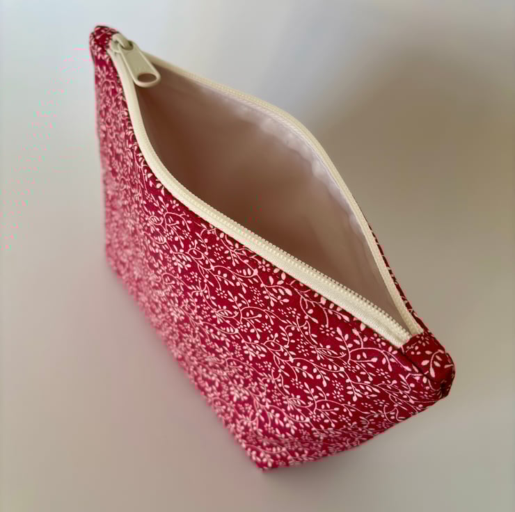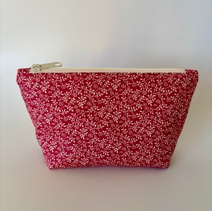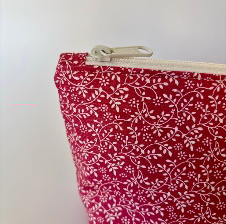 Handmade zipped fabric pouch perfect for make up or small toiletries, in deep rose pink with a delicate print of trailing leaves in cream.