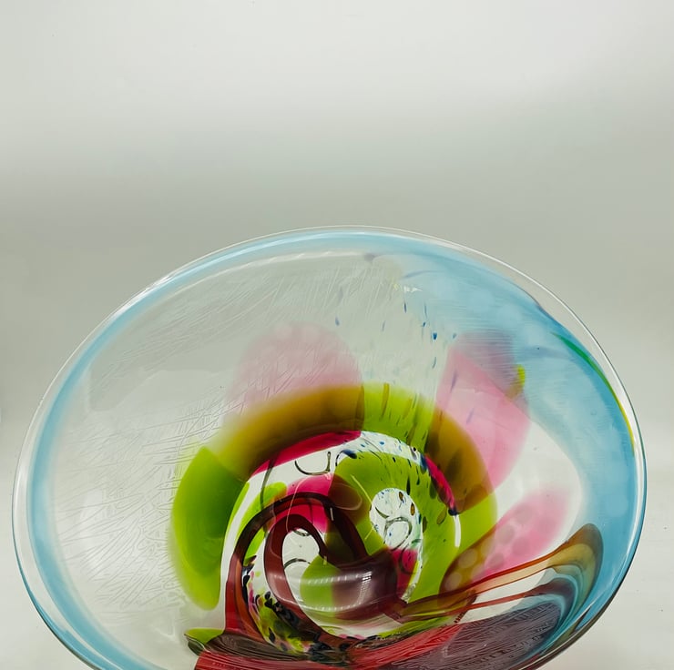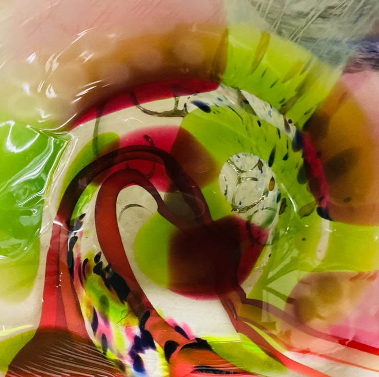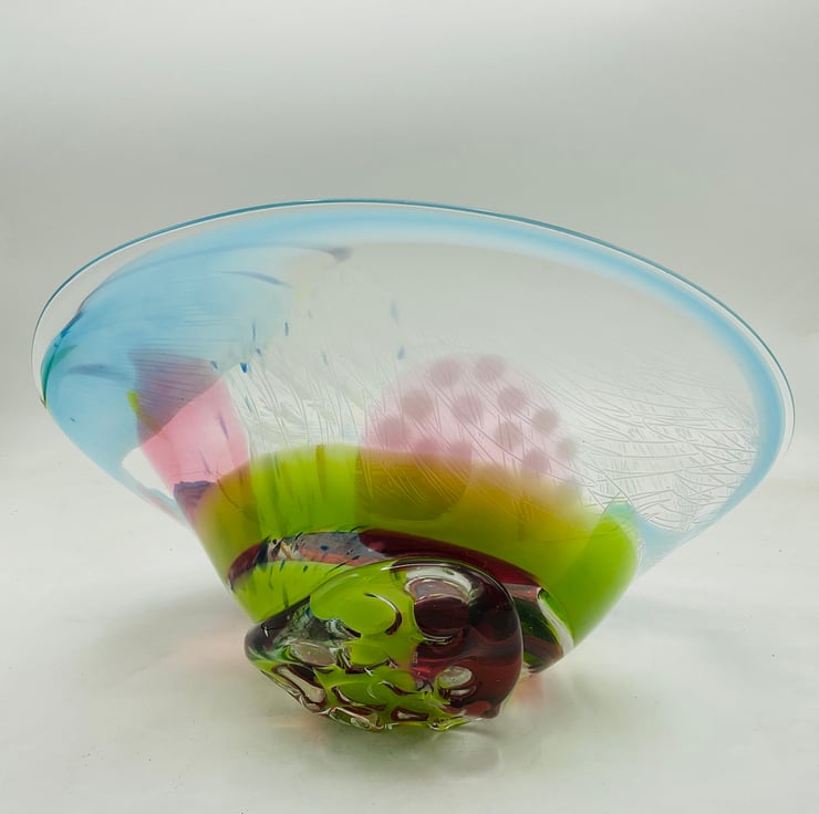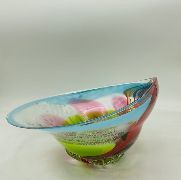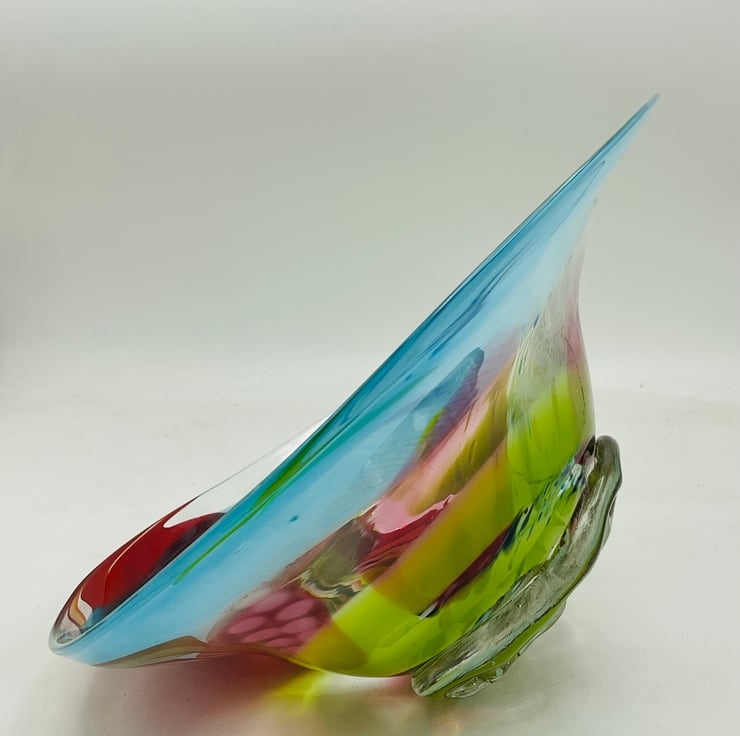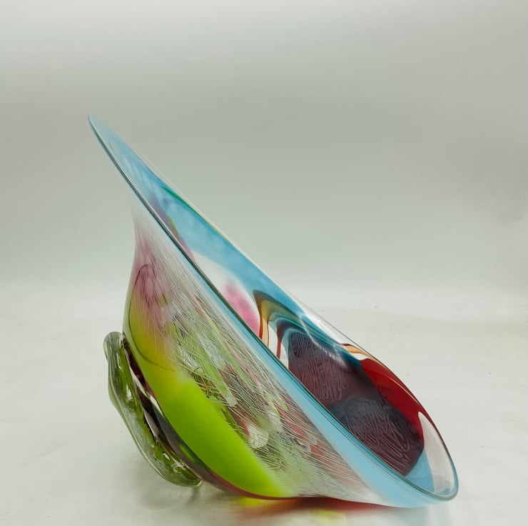 Seaform in Reds, Green,Ruby and Blue with flecks of Lime and Purple. This bowl can sit in two ways. Either flat on its base or upright on its polished facet situated at the side of the piece where my signature is. It’s all about building the layers of colour to produce a rich tapestry of shape and form and then when the piece has cooled down I add another dimension which is sandblasted detail . This Seaform measures 29cms at the widest point and 20cms high in its upright position .