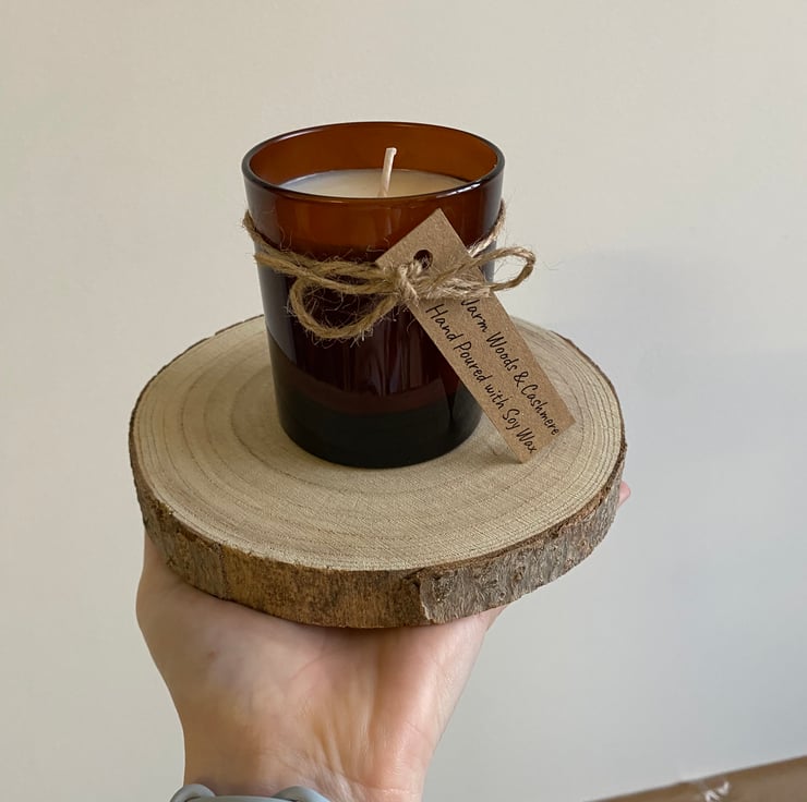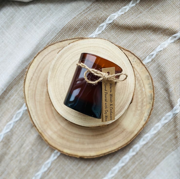 Soy wax has been melted and poured by hand into this stylish amber coloured glass jar.