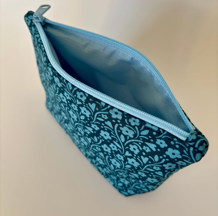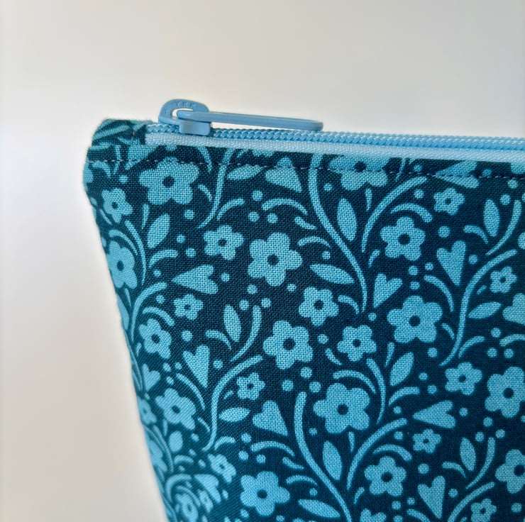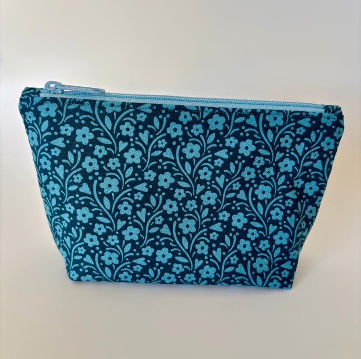 Handmade zipped fabric pouch perfect for make up or small toiletries, in navy blue with a beautiful print of flowers and leaves in blue.