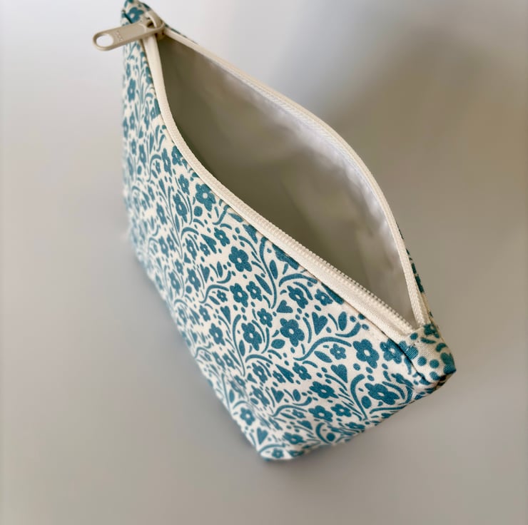 Handmade zipped fabric pouch perfect for make up or small toiletries, in cream with a beautiful print of flowers and leaves in powder blue.