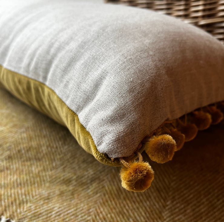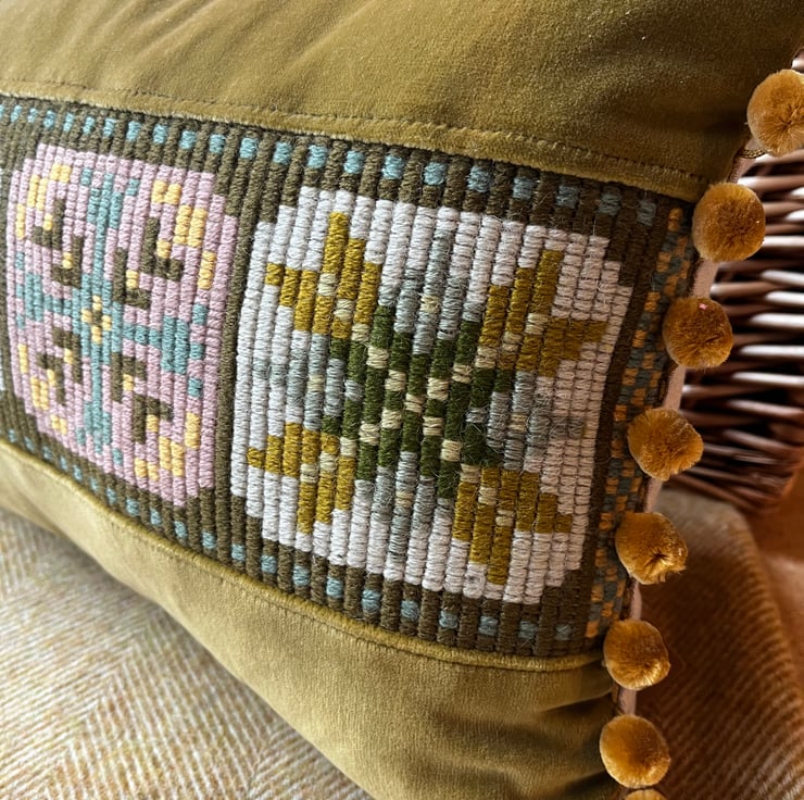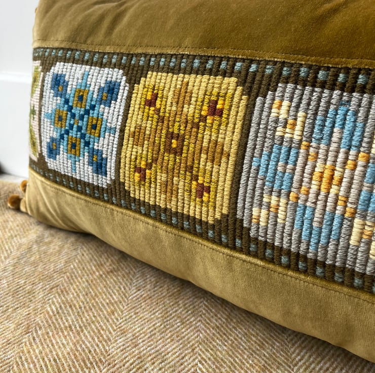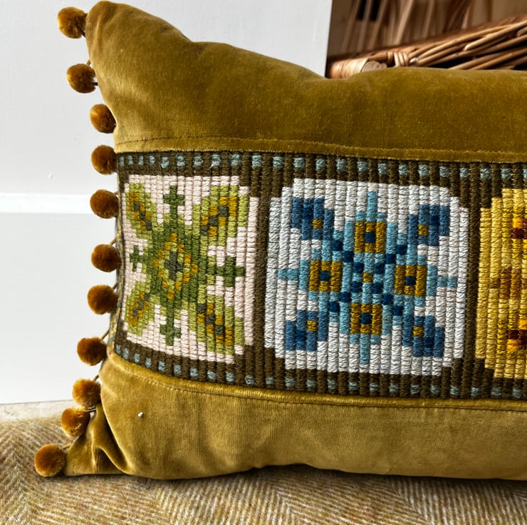 One of a kind long cushion cover featuring a stunning wool needlepoint panel framed with soft olive coloured reclaimed velvet and backed with beige linen. The ends are trimmed with gold pompoms.